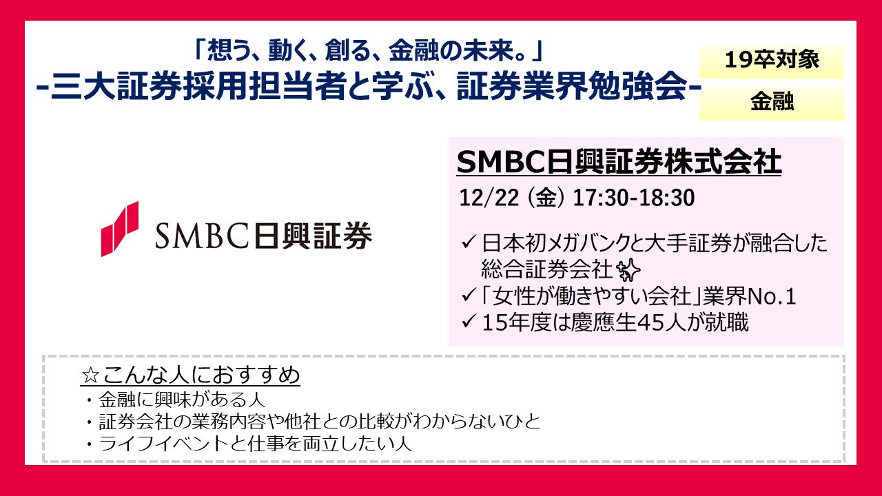 ট ইট র 知るカフェ 慶應義塾大学前店 Smbc日興証券 12 22 17 30 18 30にイベント開催 五大証券 会社の1つで 気になる新卒年収は日本トップクラス 女性の人事さんがインターンのご案内に加え 女性の働きやすさについてお話して下さいます